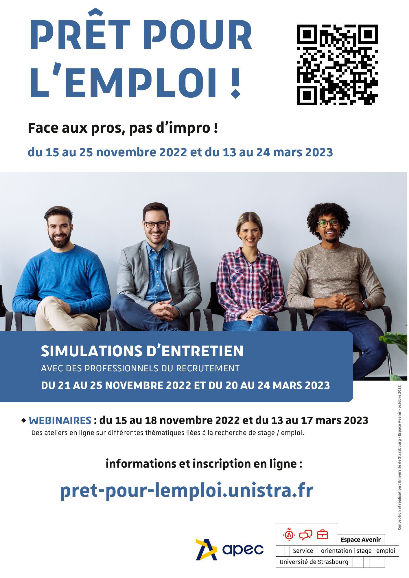 Du 15 au 25 novembre, Prêt pour l’emploi est le rendez-vous dédié à l’insertion professionnelle. Des professionnels du recrutement, des conseillers d’Espace avenir ainsi que des enseignants-chercheurs se mettent au service des étudiants pour leur donner toutes les clés d’un entretien d’embauche réussi.