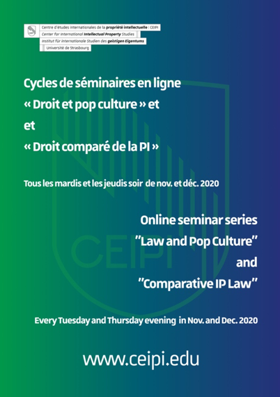Le Centre d’études internationales de la propriété intellectuelle (CEIPI) et l’Association des masters professionnels du CEIPI (AMP CEIPI) organisent deux cycles de séminaires en ligne « Droit et pop culture » et « Droit comparé de la propriété intellectuelle ». Les séminaires auront lieu tous les mardi et jeudi pendant les mois de novembre et décembre.